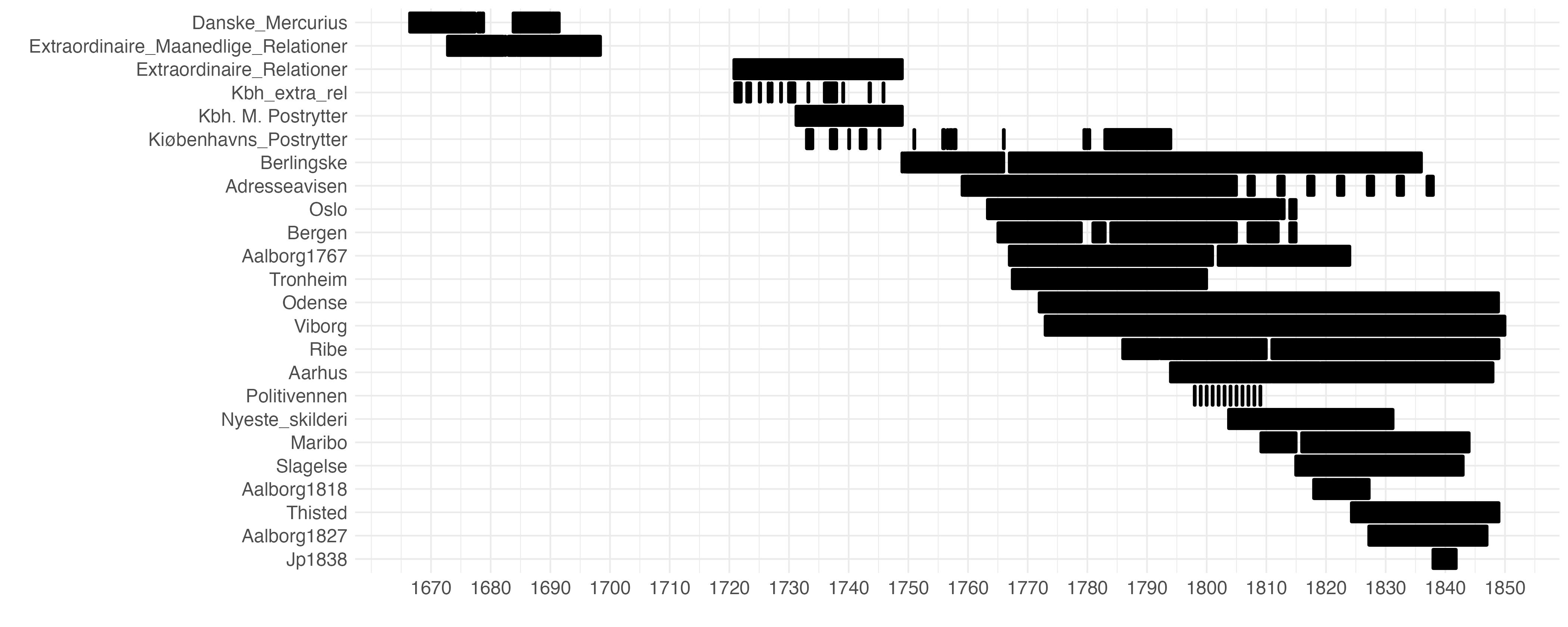 The newspapers in the dataset generally represent the longest-running newspaper series in the Danish and Norwegian libraries. We prioritised long-running newspapers to enable historical analysis of changes over time. As historians, this was our initial ambition: to allow us to get quality serial text data. We also prioritised geographical diversity, representing different regions of Denmark-Norway. Of course, this varies over time, as newspapers were most common in Copenhagen until the late eighteenth century. Since the newspapers of Denmark's Caribbean colonies were primarily in English, they are not included. The text recognition model designed for the project struggles with English text. Besides long-running series, we also included a few smaller newspaper series, mainly with an eye towards diversity of subject matter. These include Politivennen, which was concerned with very local news from Copenhagen and carried a lot of reader contributions, offering a unique insight into urban sentiments at the time. A similar inclusion was made with Jyllandsposten (of 1838), which was defined by a somewhat radical rural horizon.