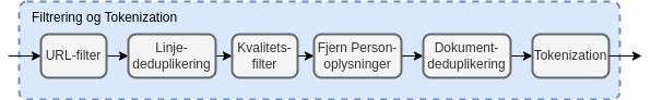 De enkelte trin er beskrevet i nedenstående afsnit. Efter filtreringstrinene bliver vores tekstdata tokenized, dvs. konverteret til et binært format der kan læses af modellen.